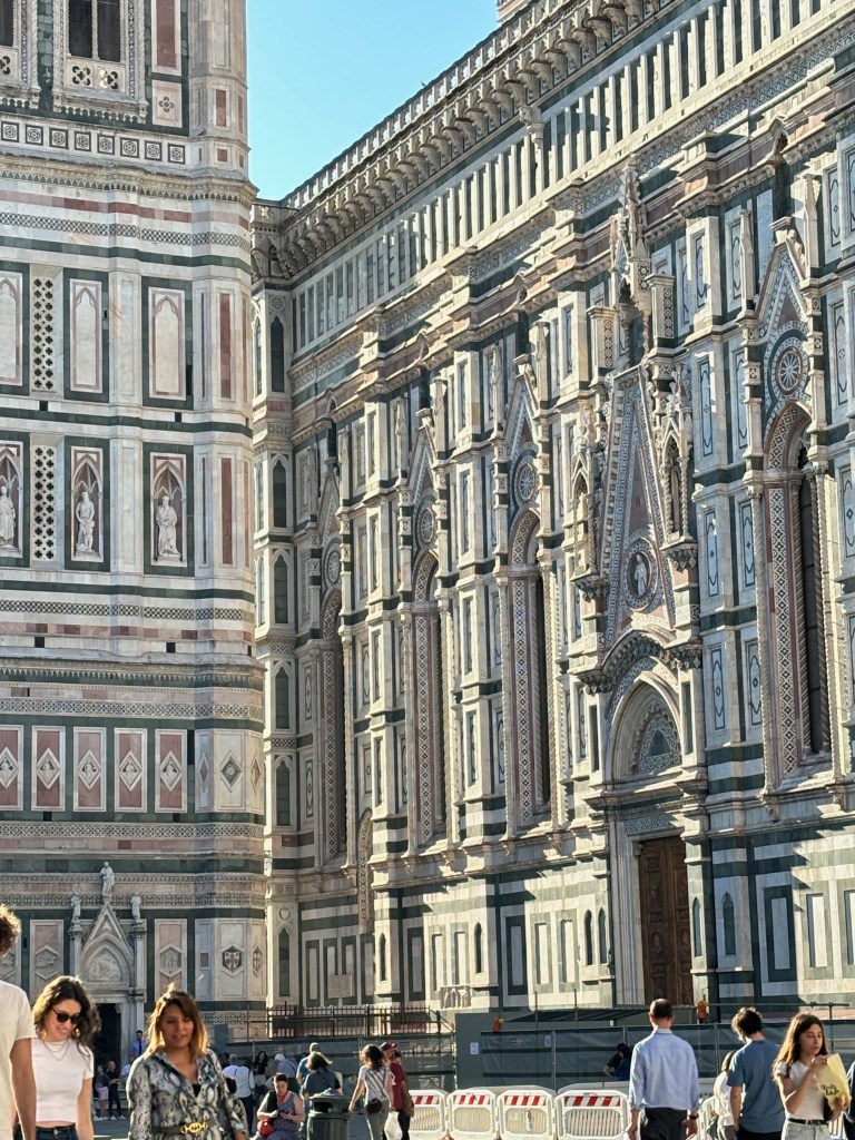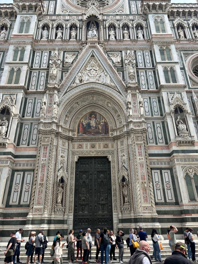 Our first evening in Florence we found the Cathedral of Santa Maria del Fiore, which is a marvel of white, green, and red marble. They started building this cathedral in 1296 and it wasn’t finished until 1436. One of the charms of this breath-taking building is that when they started building it, they had no idea how to make a dome that would cover the top.